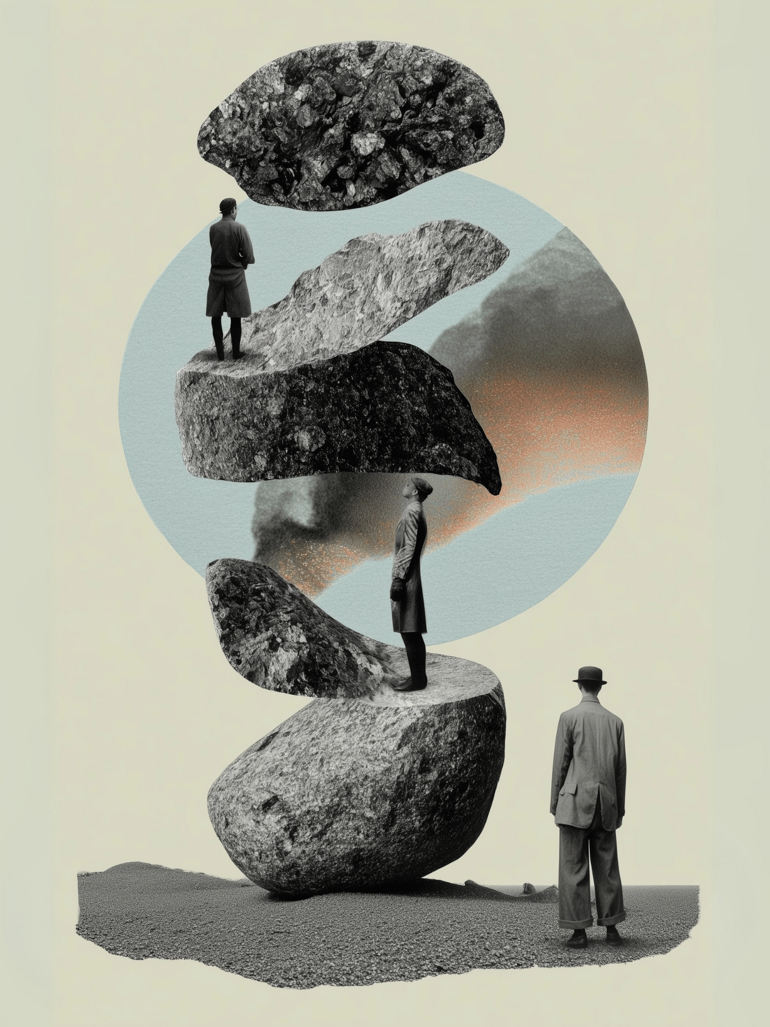 This surreal collage artwork features a series of floating, jagged stone slabs stacked vertically like a mystical staircase suspended in space. Atop each layer stands a solitary man in a vintage coat, frozen mid-thought, creating a visual metaphor for introspection, isolation, and existential ascent. A softly blended circular background hints at abstract skies or parallel dimensions, further emphasizing the image’s dreamlike detachment from reality.