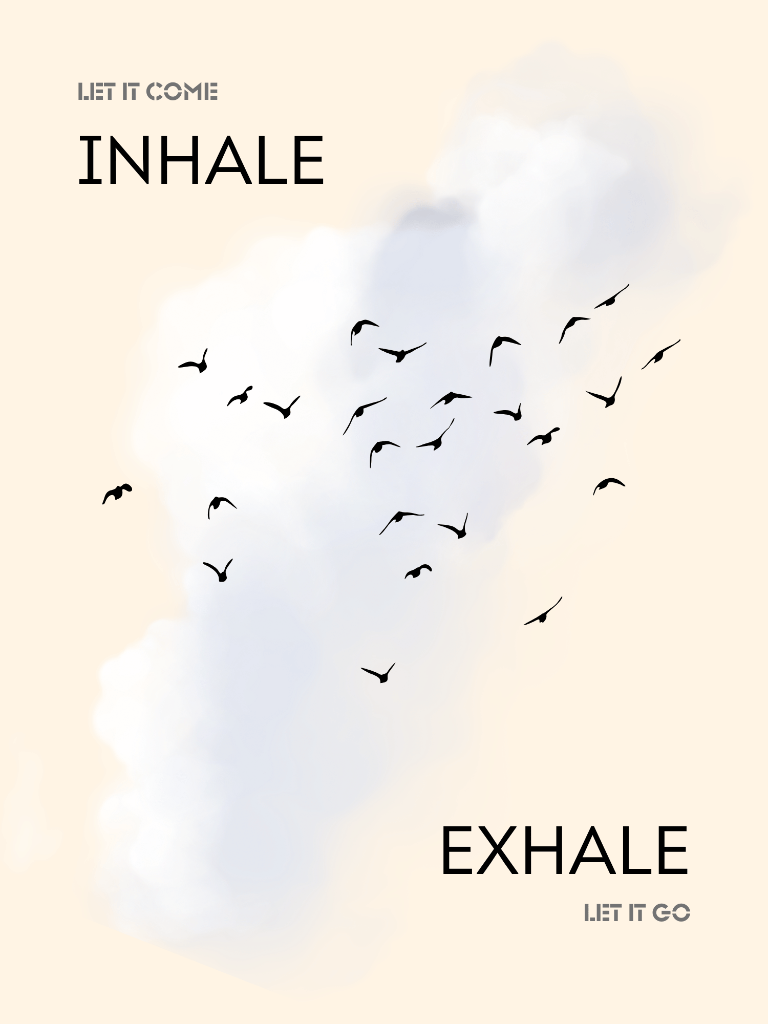 Inhale exhale affirmation with flying birds is a soothing digital artwork that blends minimalist visuals with powerful words of mindfulness. At the heart of the composition, bold typography reads “Inhale – let it come” and “Exhale – let it go,” framed by soft clouds and a flock of birds gracefully soaring across the canvas. The cream-toned background enhances the feeling of lightness and calm, making it a perfect piece for mindful interiors and wellness-focused spaces.
