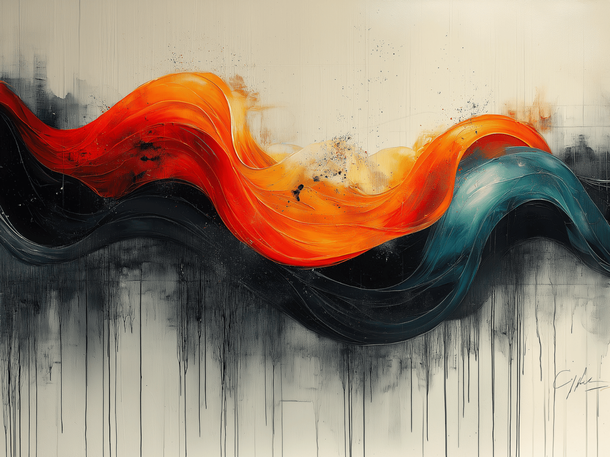 Experience the power and beauty of our latest abstract artwork, Waves of Fire and Shadow. This stunning piece features bold, fluid waves of fiery orange and deep teal, sweeping across a neutral background. The dynamic composition captures intense energy and emotion, blending light and dark in a captivating flow.