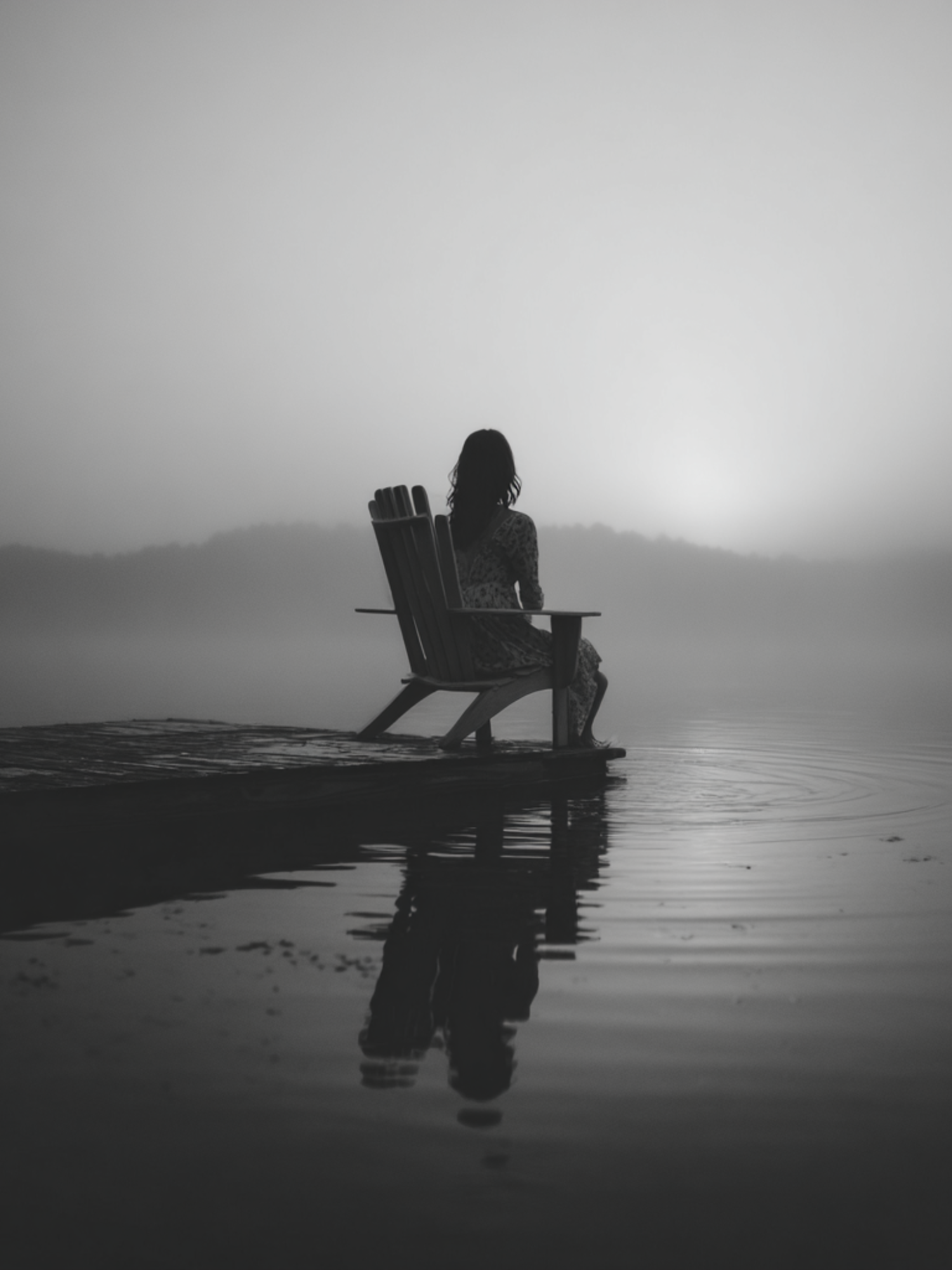 This serene black-and-white photograph captures a woman seated quietly on a wooden dock, surrounded by still waters and a gentle fog-shrouded sunrise. Her figure is calm and centered, reflected softly in the rippling lake, evoking a powerful sense of solitude, stillness, and introspection.
