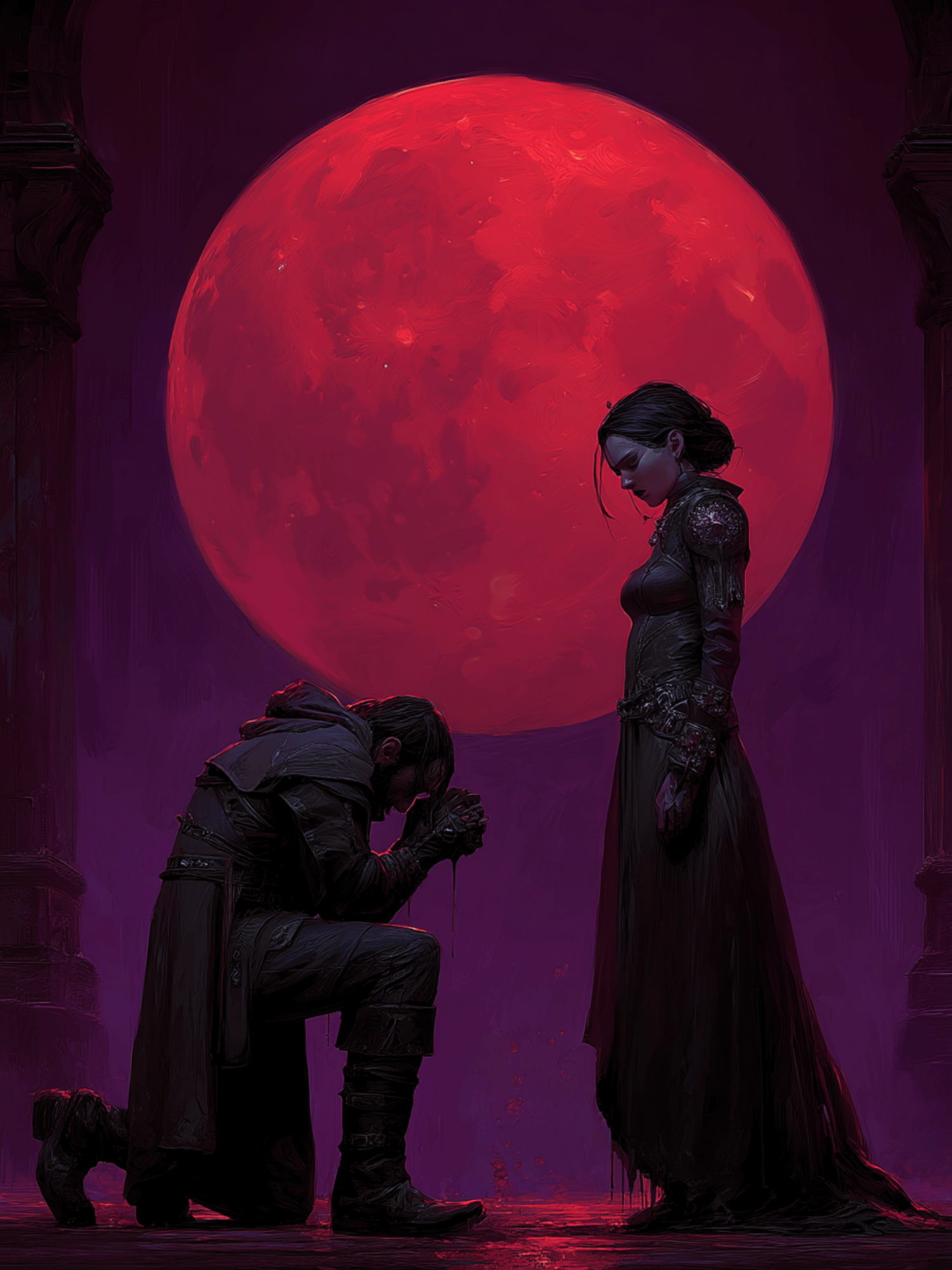 Every element of this artwork is crafted with striking visual drama — from the intricate folds of the characters’ cloaks to the ethereal light reflecting off the moon’s burning surface. The deep purple shadows and blood-red highlights create an emotional tension that pulls the viewer into an otherworldly realm. It feels like a moment frozen in time — a vow sealed beneath the blood moon, echoing the themes of loyalty, loss, and transcendence.