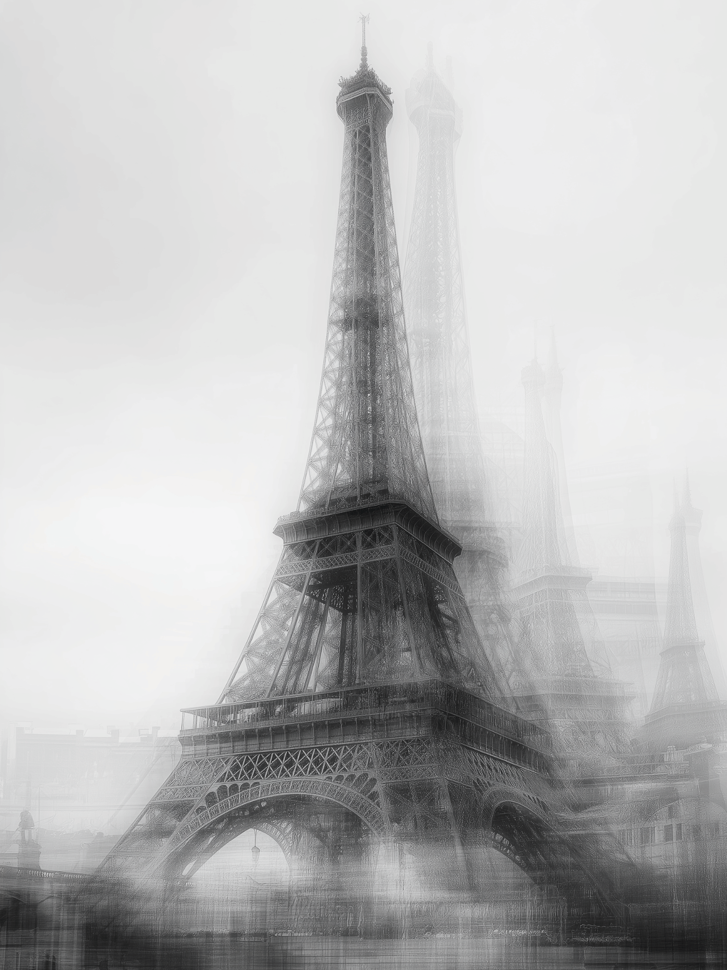 Ghosts of the Eiffel Tower in Paris fog is a hauntingly beautiful cityscape artwork that captures the ethereal elegance of Paris in a dreamlike atmosphere. This monochrome piece features multiple translucent impressions of the Eiffel Tower rising through layers of dense, whispering fog, creating an illusion of motion and memory.
