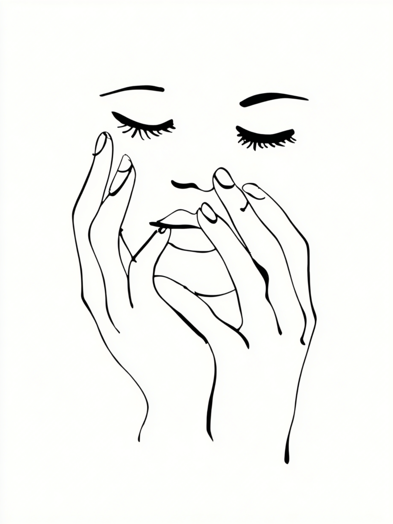 This elegant minimalist line drawing features a serene face with closed eyes and delicate hands gently touching the cheeks and lips. Rendered in smooth, confident black lines, the artwork captures a quiet moment of introspection, self-care, and inner calm.