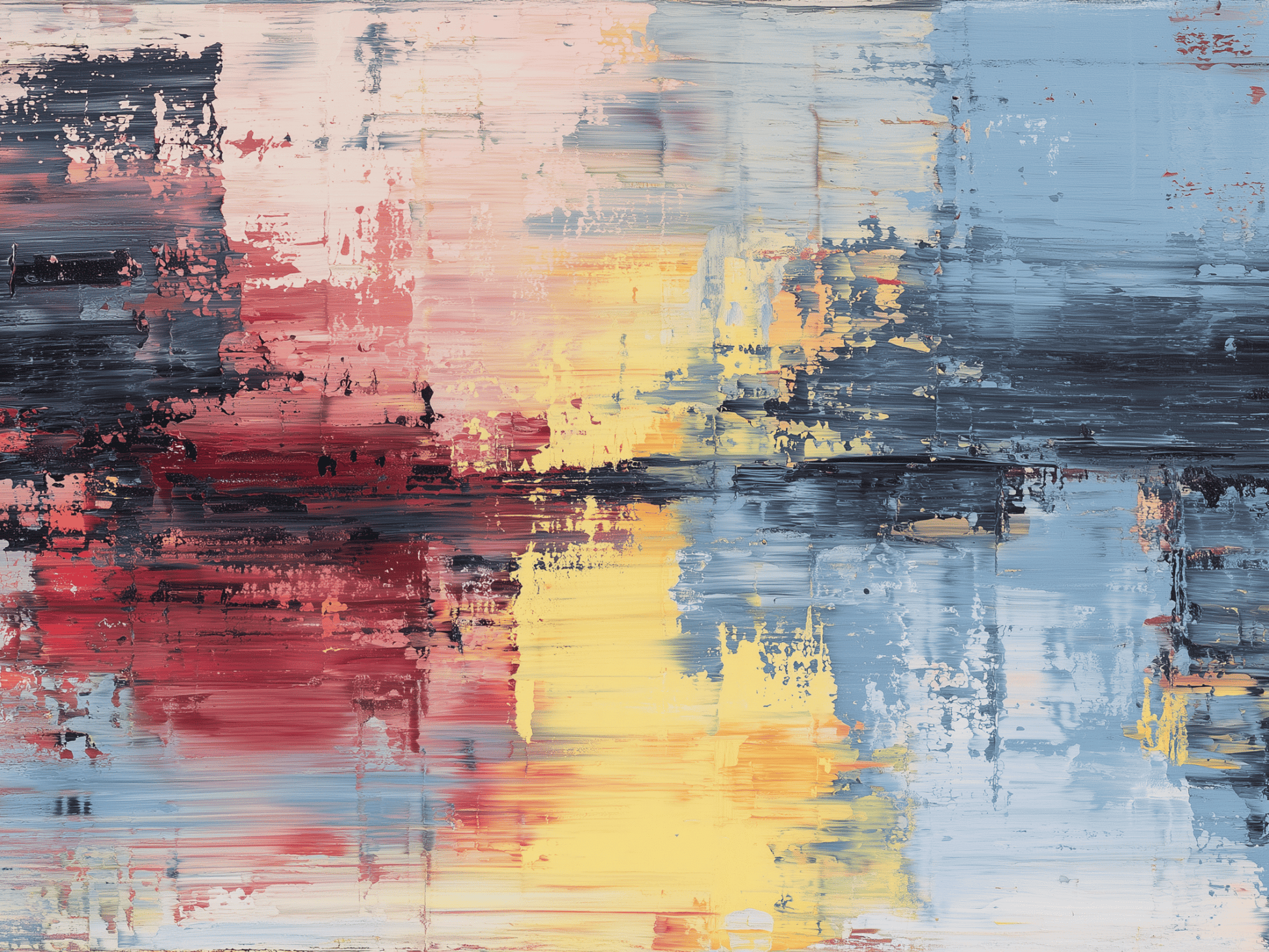 dissolution of color and form, much like memories fading into twilight. With its richly textured surface and horizontal brushwork, this piece guides the viewer through a visual journey of deep reds, golden yellows, pale blush tones, and stormy blues.