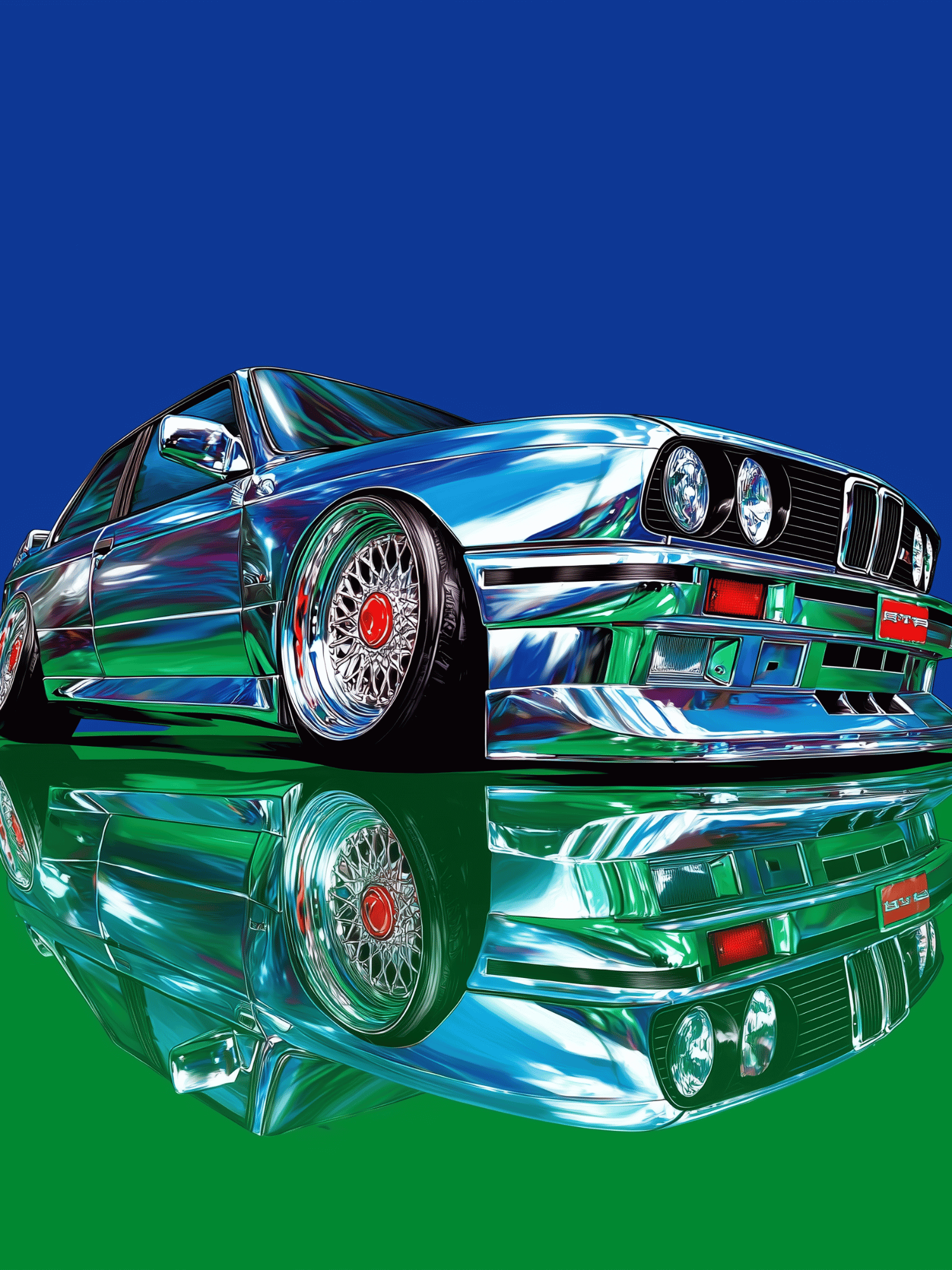 Experience the timeless charm of automotive design with Retro BMW reflection art, a stunning digital artwork celebrating the bold geometry and iconic aesthetic of vintage car culture. The piece captures a beautifully stylized BMW model, polished to perfection, its chrome surfaces gleaming against a vivid blue and green background. The mirror-like reflection beneath amplifies its symmetry and precision engineering, evoking the golden age of motoring when design met performance in perfect harmony.