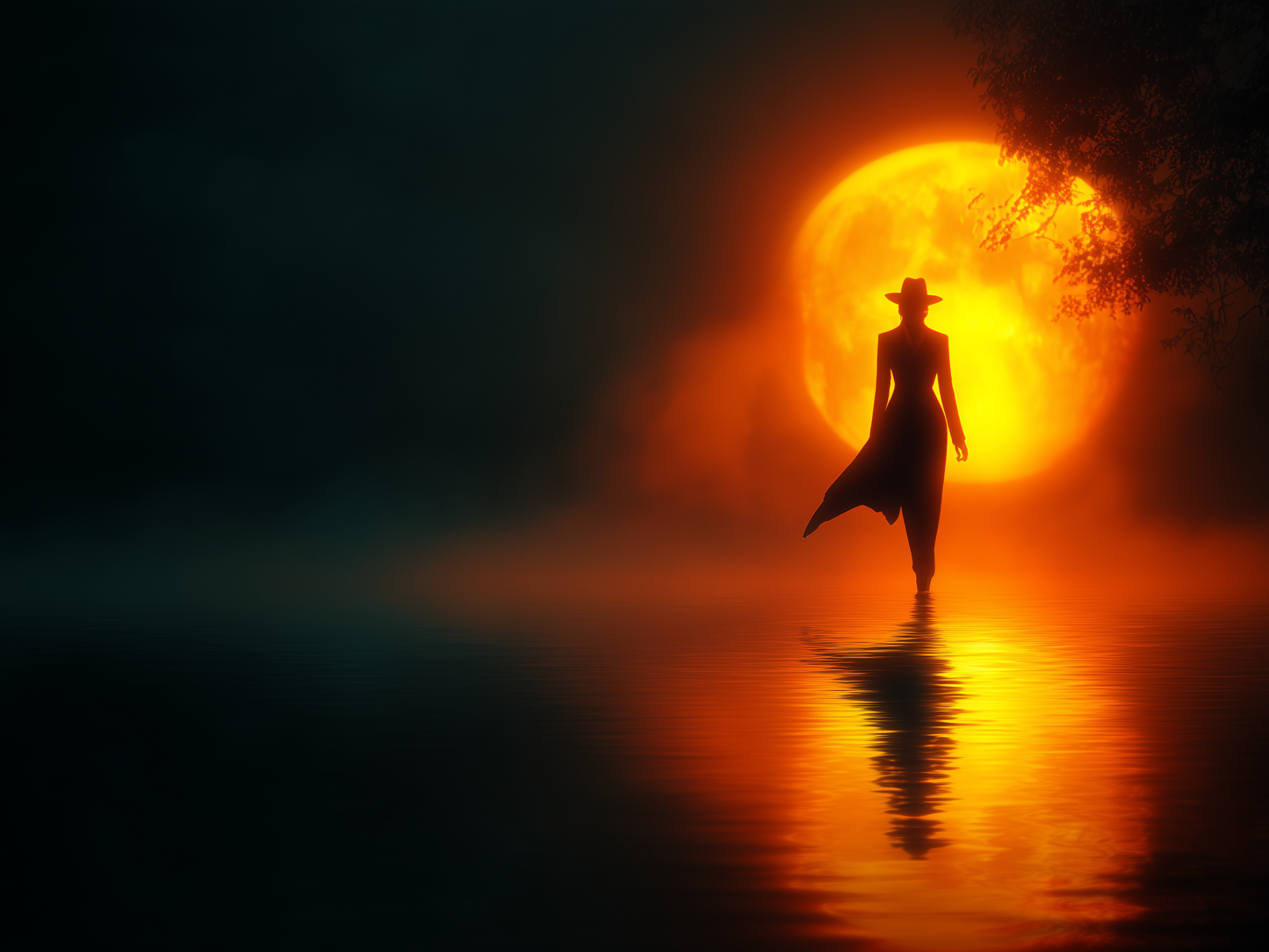 A surreal and cinematic visual, "Silhouette woman walking toward moon" features a mysterious figure gracefully approaching a glowing full moon. The woman, dressed in a flowing gown and wide-brimmed hat, appears to walk on the still surface of water, surrounded by an atmospheric fog and deep shadows. The massive, fiery-orange moon dominates the sky, casting golden reflections across the water and enveloping the entire scene in a dreamlike, magical glow.