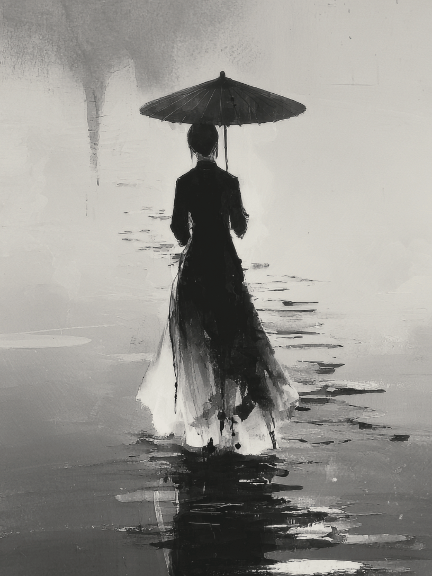 Solitude in monochrome rain is a strikingly minimalistic black-and-white digital painting that captures the essence of quiet reflection and emotional depth. A solitary figure, elegantly dressed, walks with an umbrella through still waters, their shadow softly dissolving into the rippling surface. The restrained palette and soft brushwork evoke a sense of tranquility, mystery, and introspection.