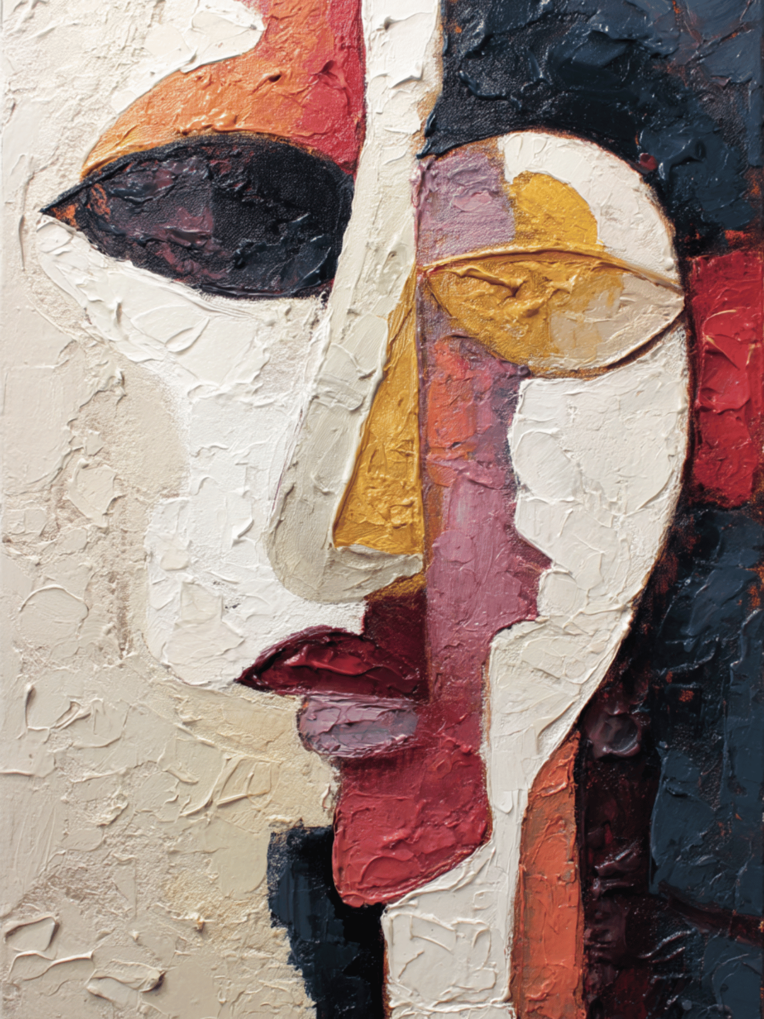 The asymmetry and sharp contrasts evoke themes of duality, inner emotion, and identity, while the tactile depth gives the artwork an organic, raw presence. It feels both contemporary and timeless, drawing from cubist influences and modern abstract expressionism.